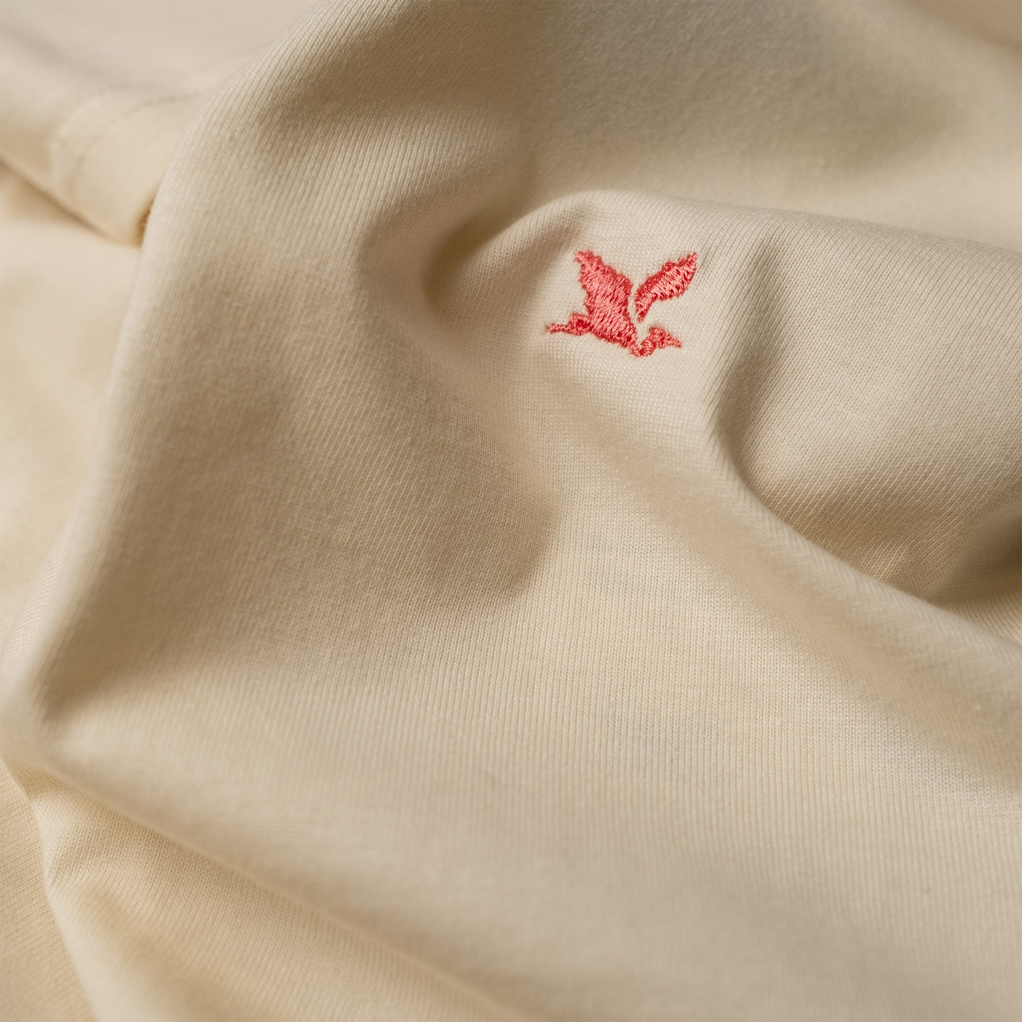 - Neck ribbing side seams, shoulder-to-shoulder tape, and double needle hems.