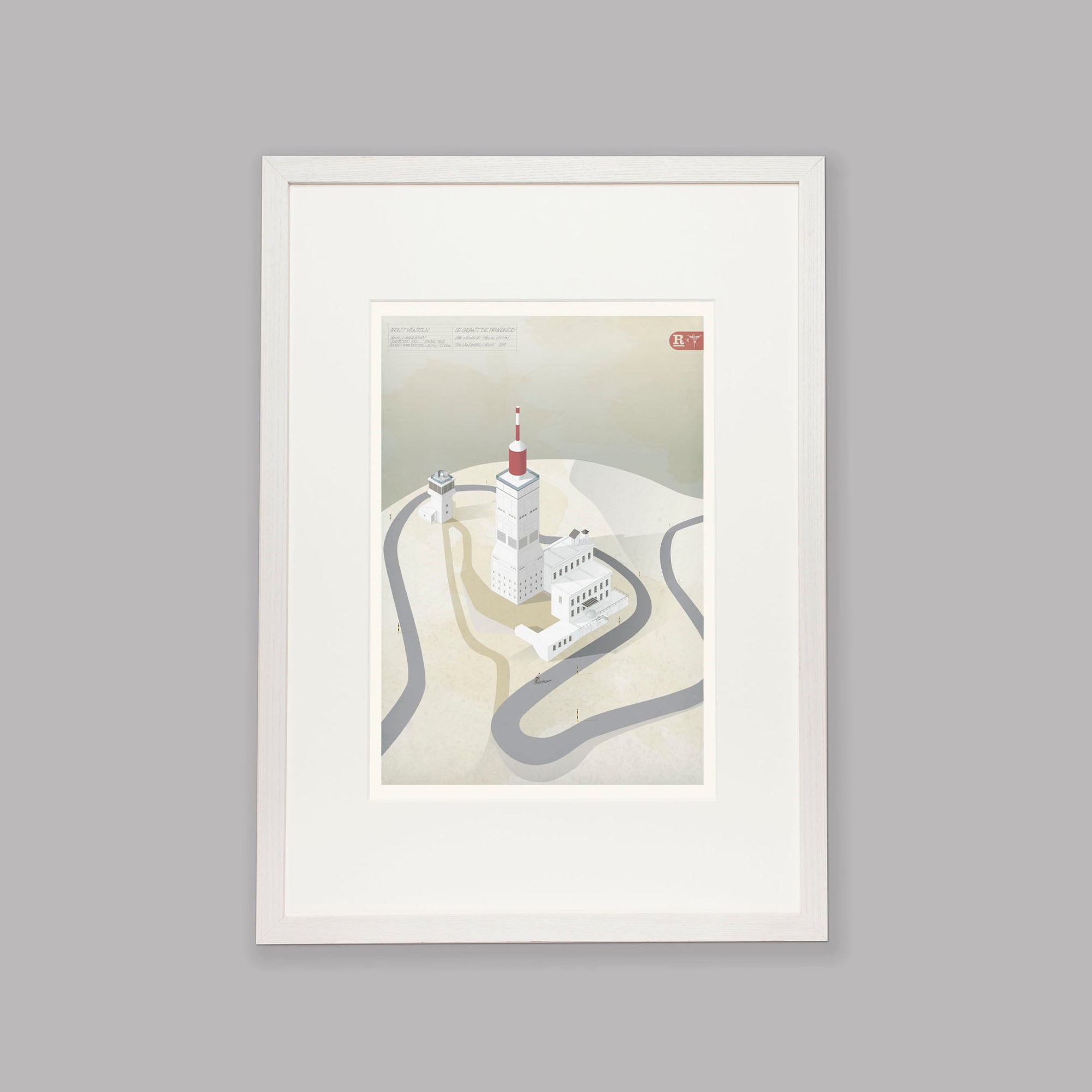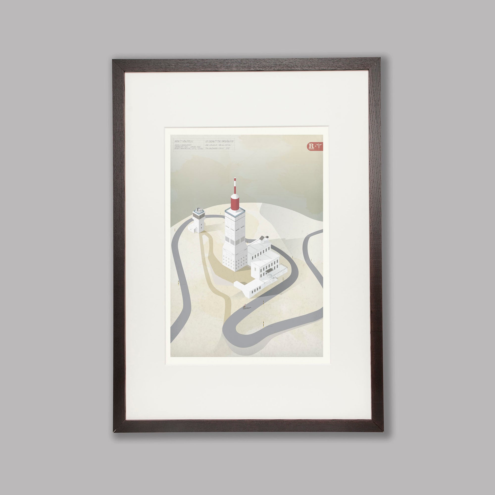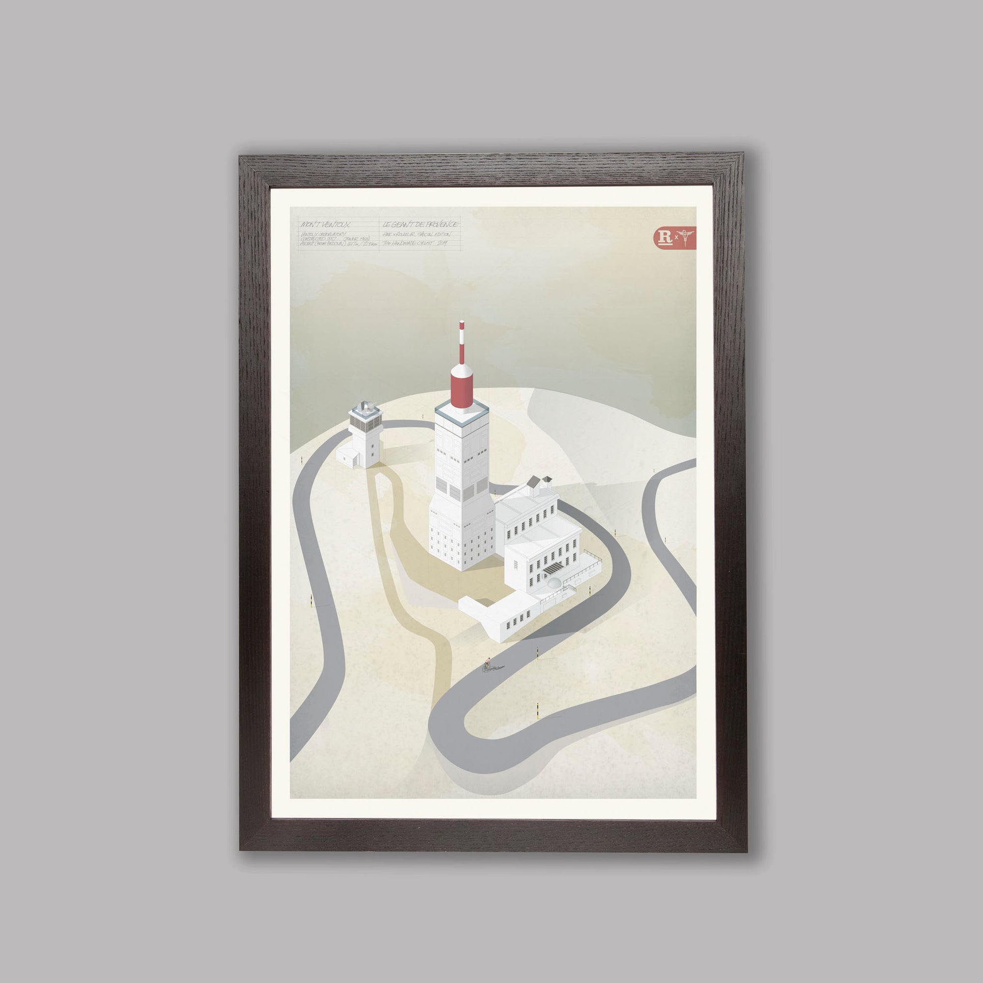 This artwork, produced as an exclusive partnership between the Handmade Cyclist and Rouleur Magazine, painstakingly explores the features of the barren summit in the style of classic architectural watercolours, with fine detailing, subtle textures and the washed-out palette of the most brutal summit in cycling.